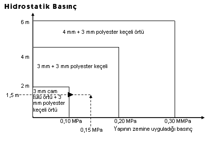 Örnek olarak su basıncı 1.5m, zemin basıncı 0.15 MPa olan bir temel yalıtımında uygulanacak olan detay 3mm + 3mm polyester keçeli iki kat örtüdür.